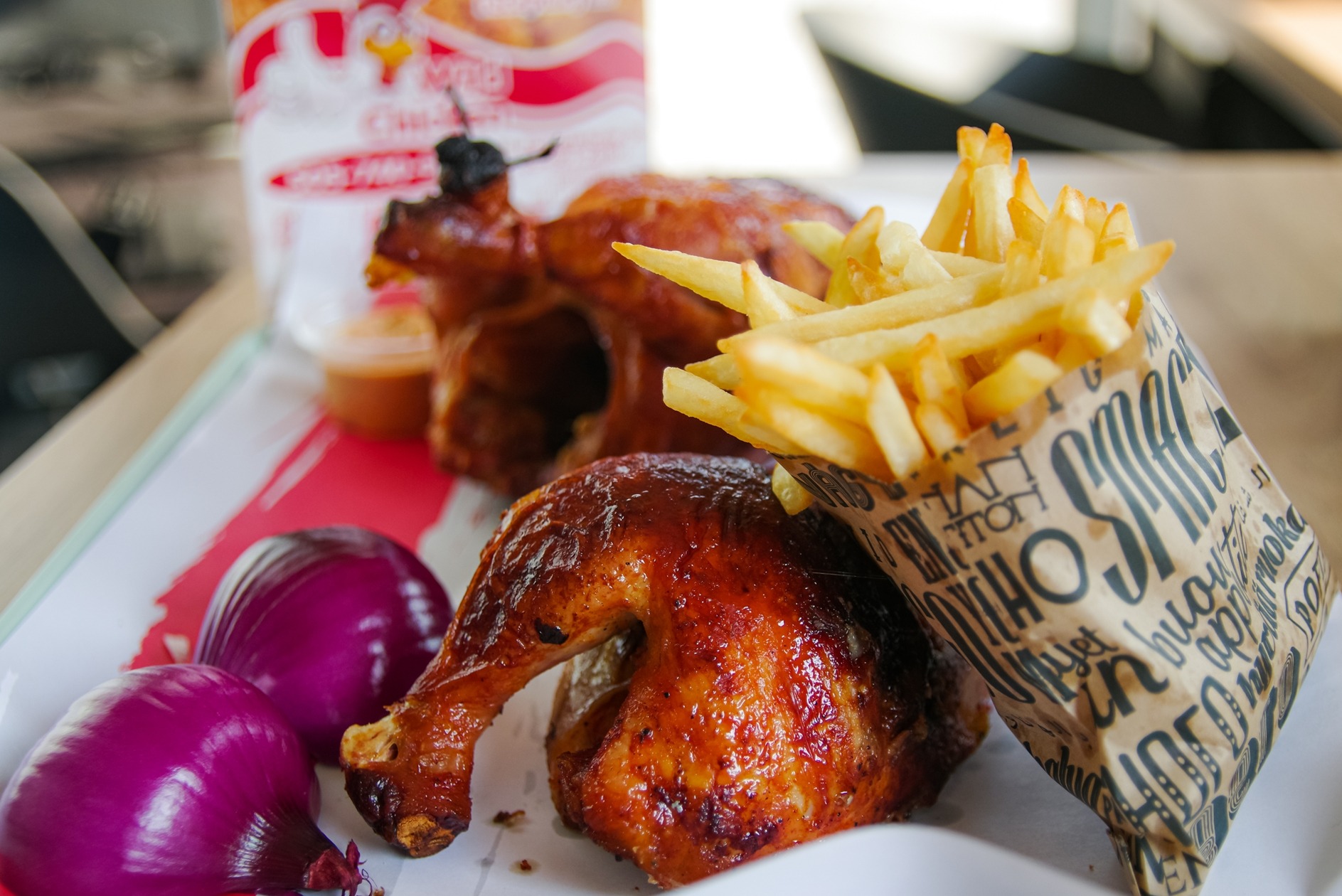 Połówka Kurczaka z rożna, frytki lub ziemniak z ogniska, surówka, sos do wyboru. -