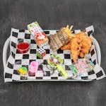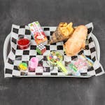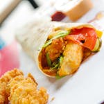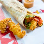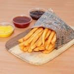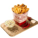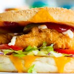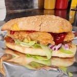 Bułka pszenna 40 cm, mix serów, pieczarki, chrupiące strips.