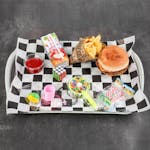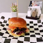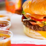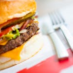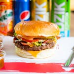 Burger z kotletem wołowym 100 gr, ogórek kiszony i ketchup.